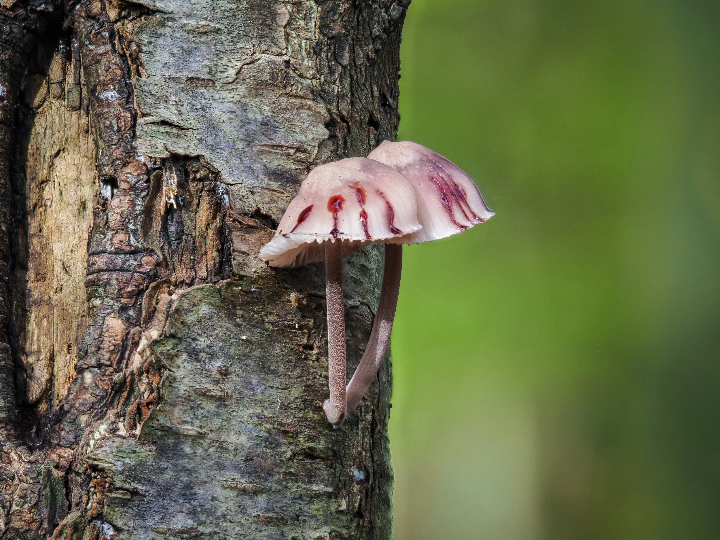 De bloedsteelmycena (Mycena haematopus) "bloedt" doordat hij een roodachtig melkachtig sap afscheidt als zijn steel beschadigd wordt. Dat sap komt uit speciale cellen in de steel, en stroomt naar buiten als de structuur breekt.