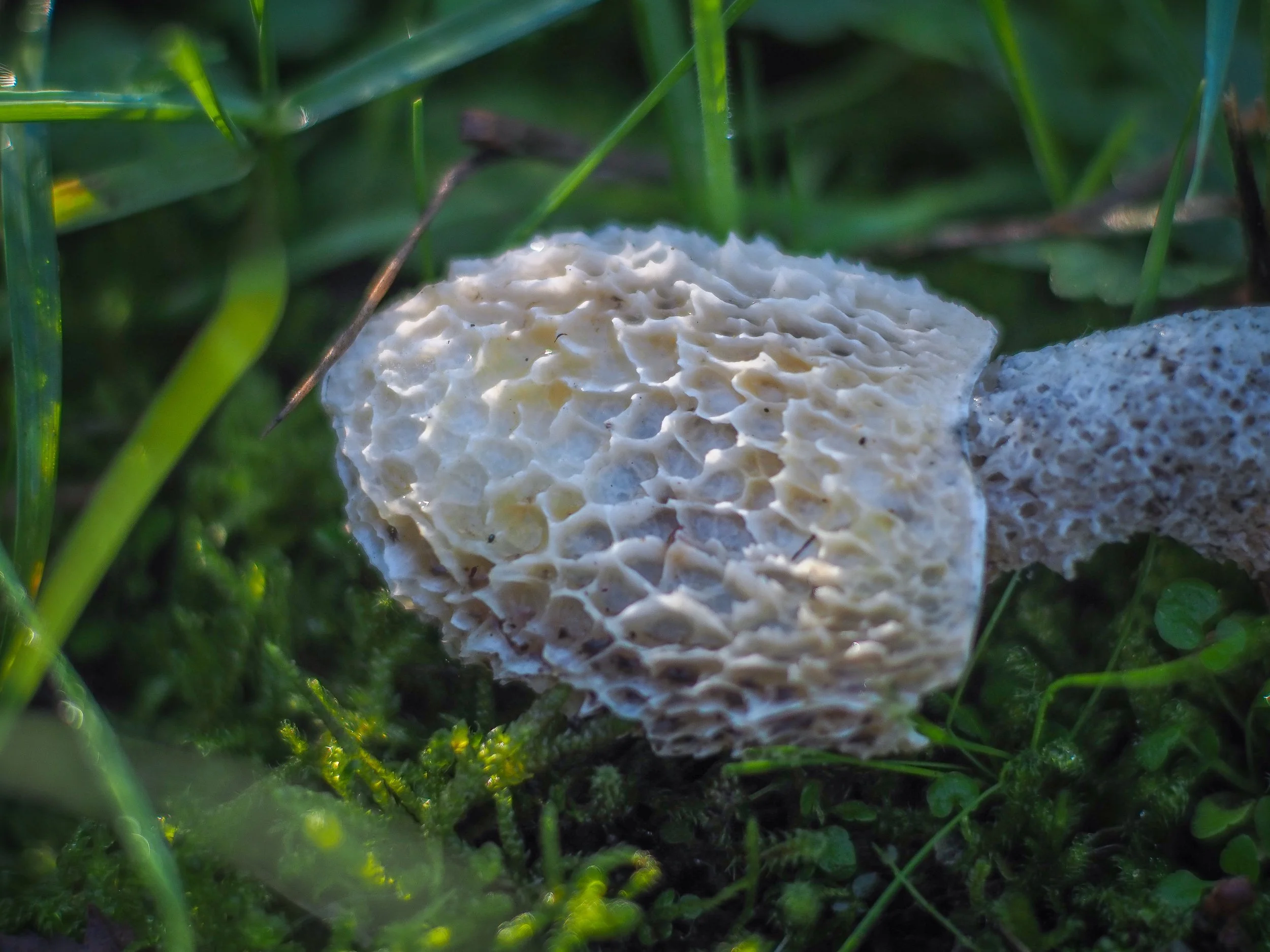 Onder het stinkende slijmlaagje (de gleba) zit de echte hoed van de stinkzwam. Die hoed heeft een duidelijke honingraatachtige structuur: een netwerk van diepe, zeshoekige groeven en richels.
