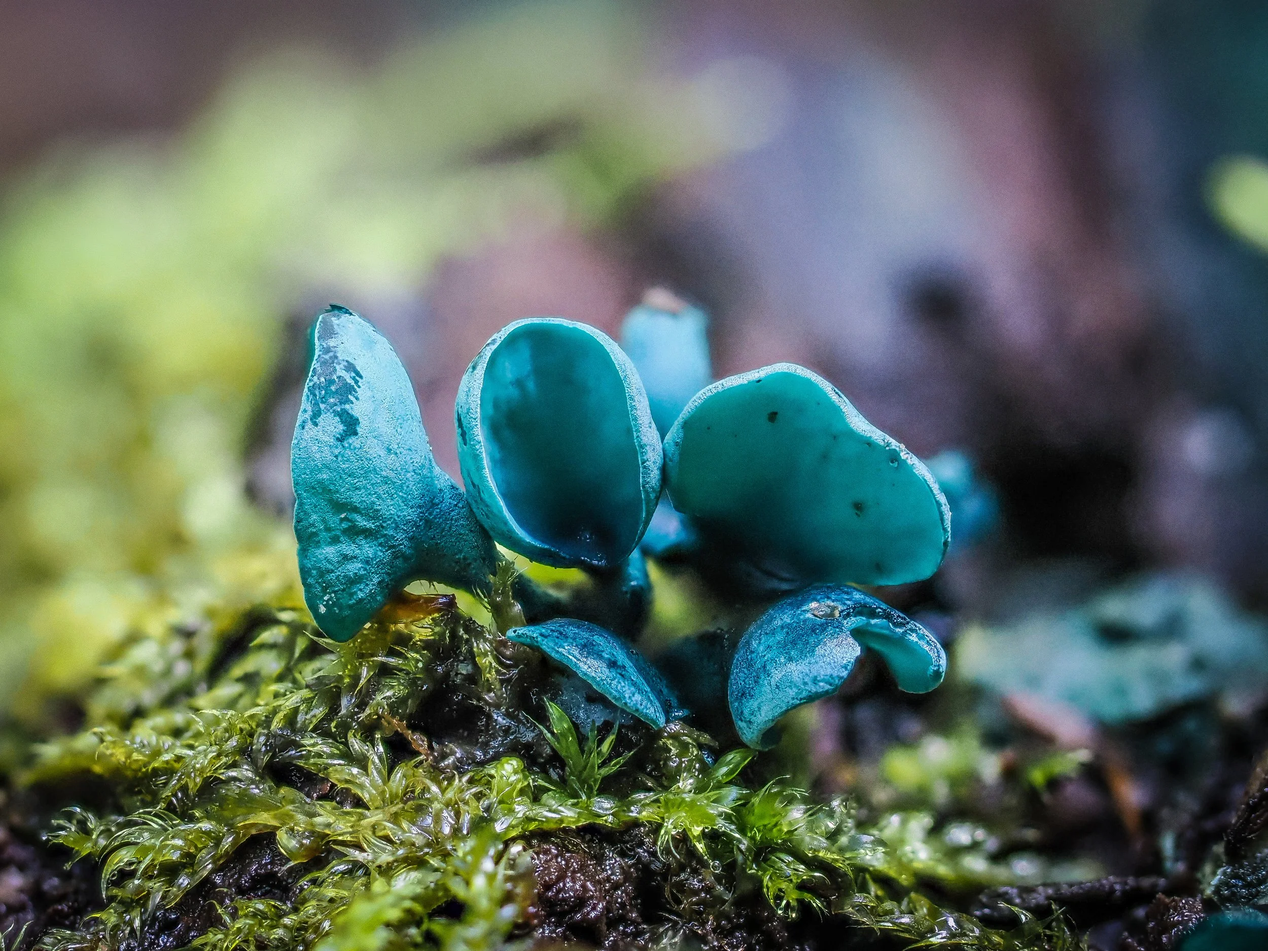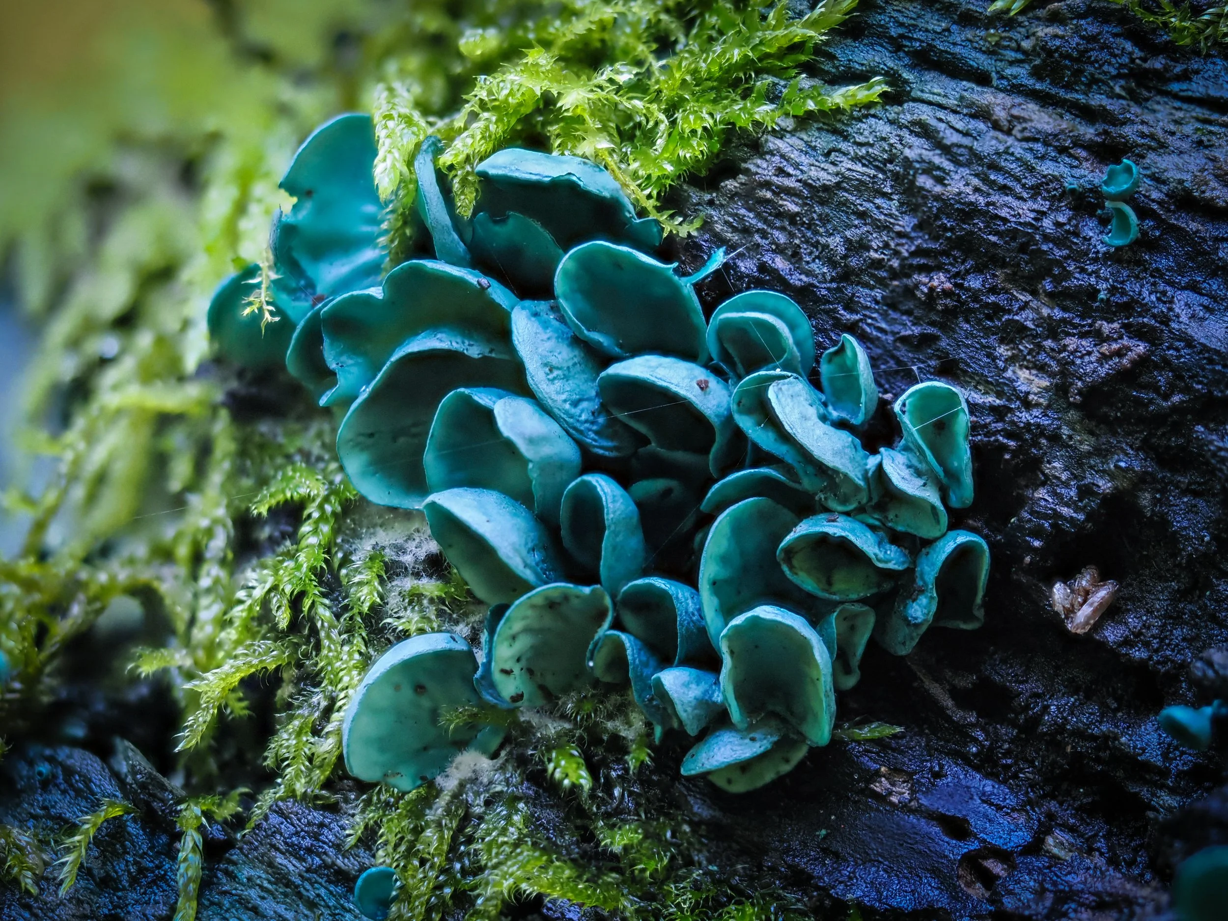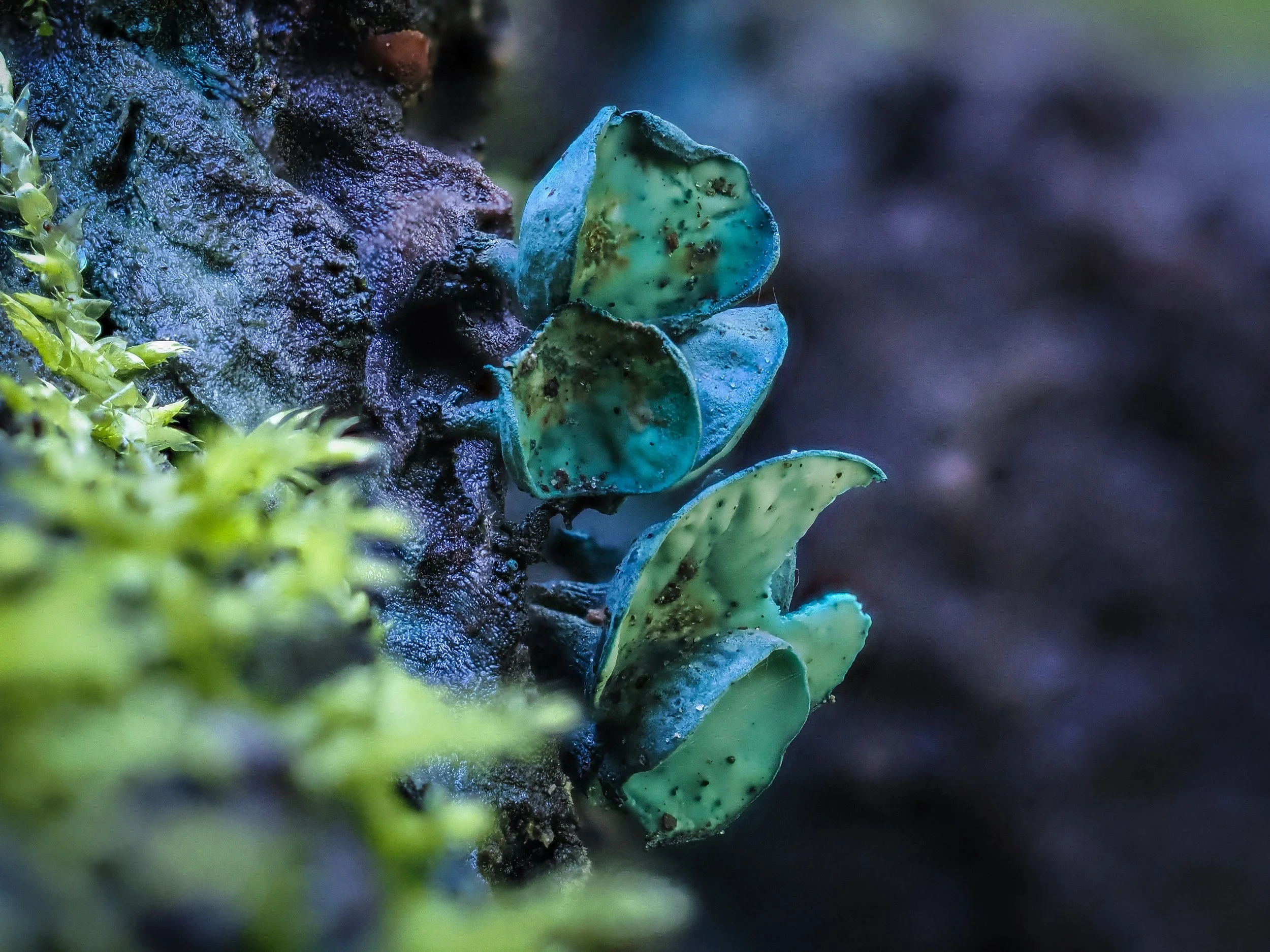 Maar het échte spektakel zit in het hout waarin hij leeft: dat kleurt diep blauwgroen door een pigment dat de zwam afscheidt, genaamd xylindeïne. Zelfs als de zwam zelf verdwenen is, blijft dat gekleurde hout zichtbaar – soms jarenlang.