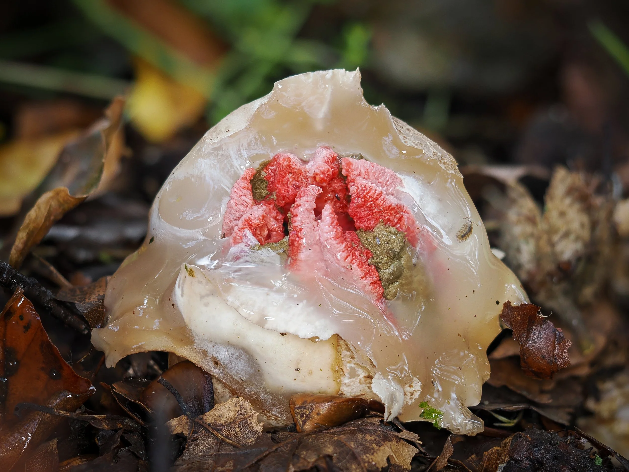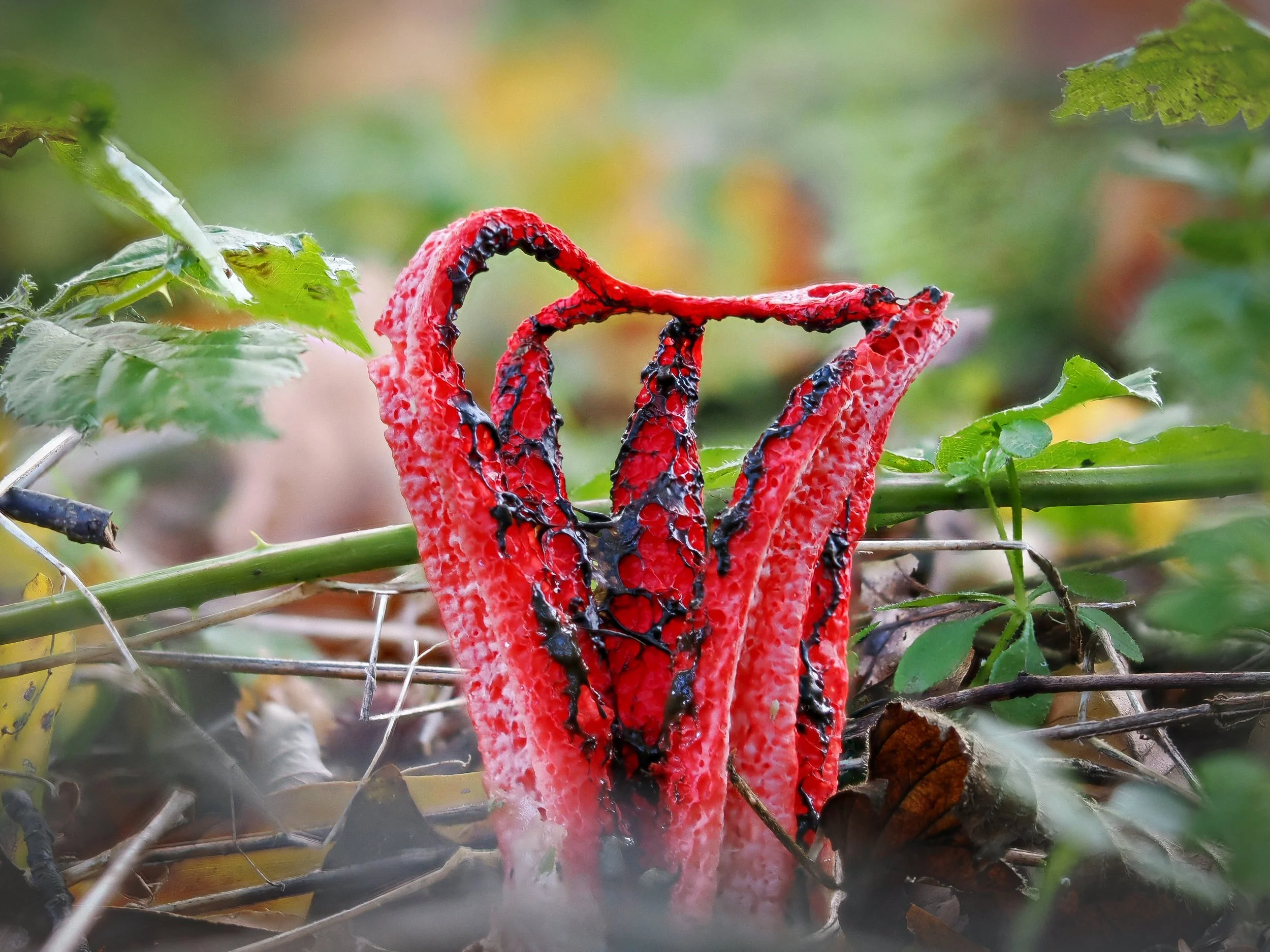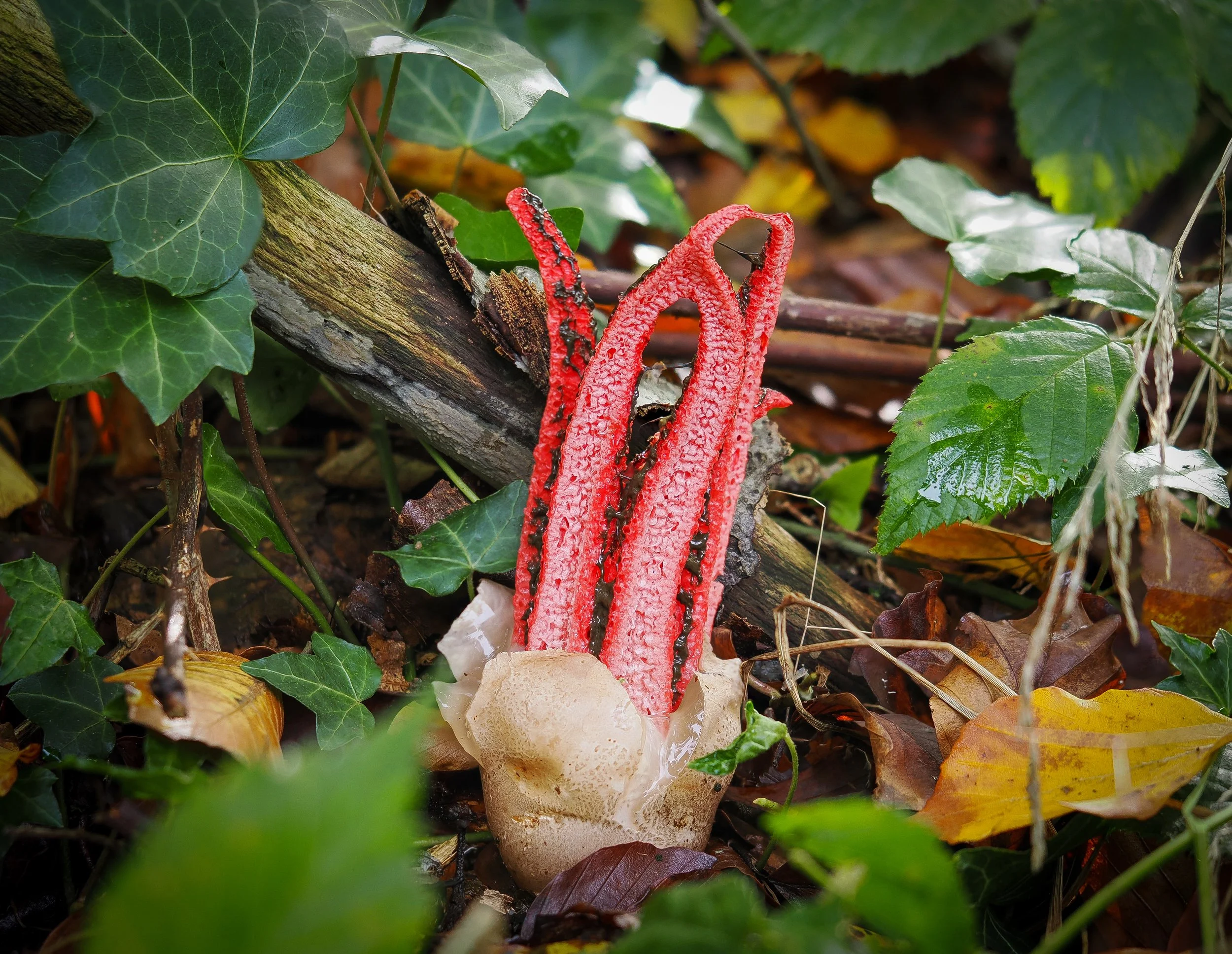De inktviszwam is een bizarre verschijning met de officiële naam Clathrus archeri. Hij begint z’n leven als een soort slijmerig ei, verstopt tussen het gevallen blad. Maar zodra hij “uitkomt”, barst het ei open en vouwen zich een paar bloedrode tentakels naar buiten – vaak vier tot zes – met aan de binnenkant een zwart, stinkend goedje dat vliegen aantrekt. Alsof hij zelf ook niet helemaal blij is dat hij er is.