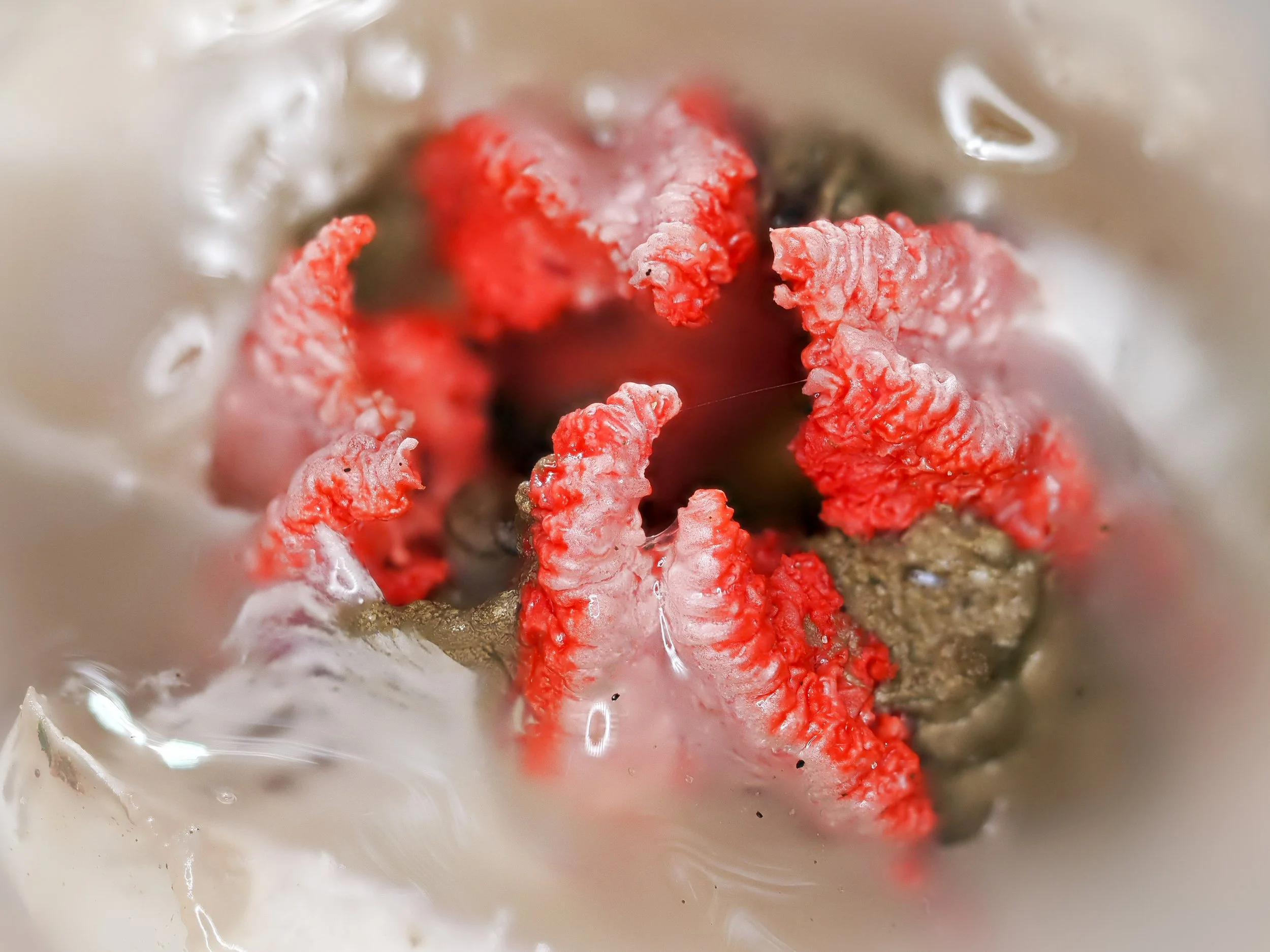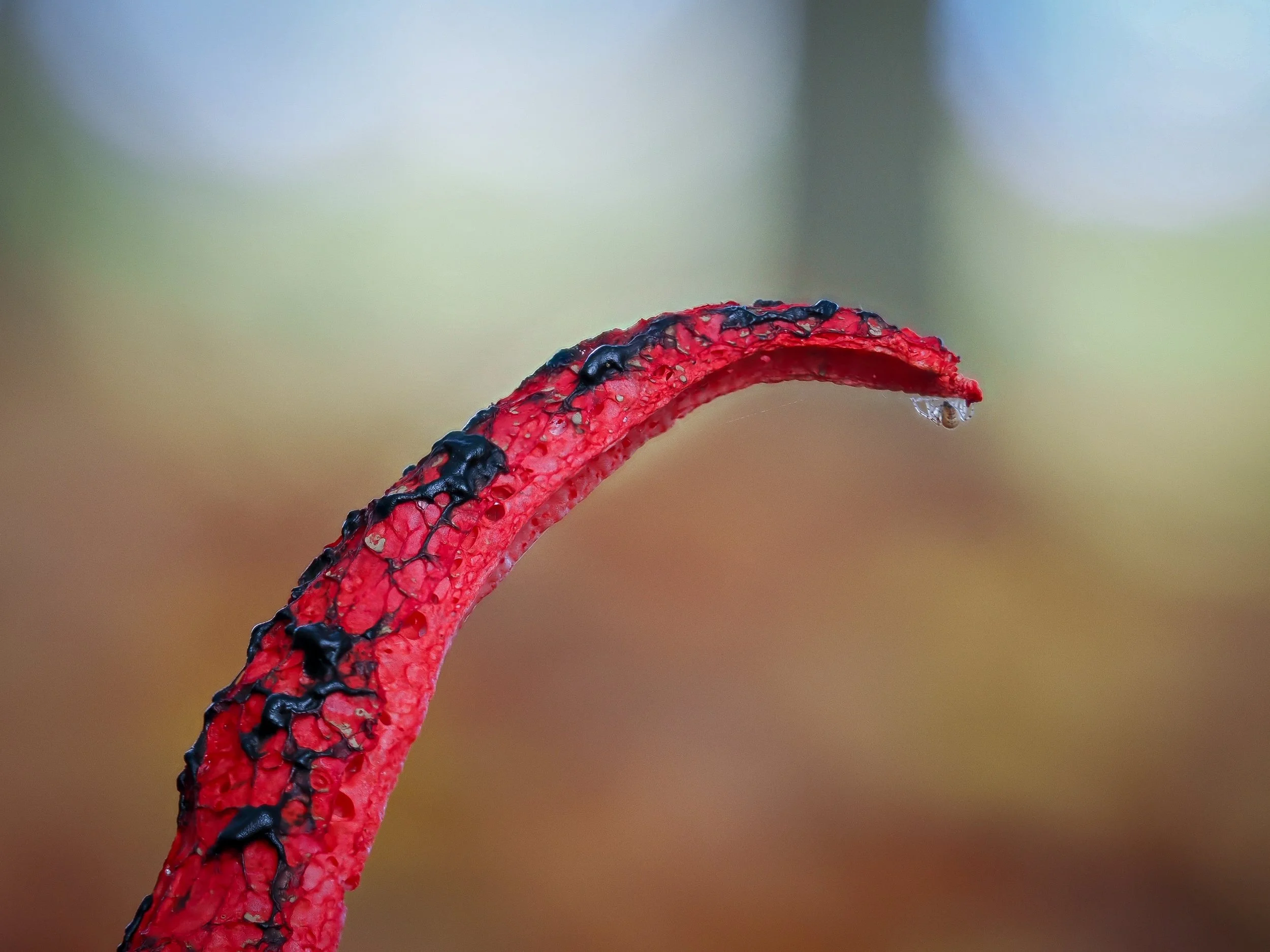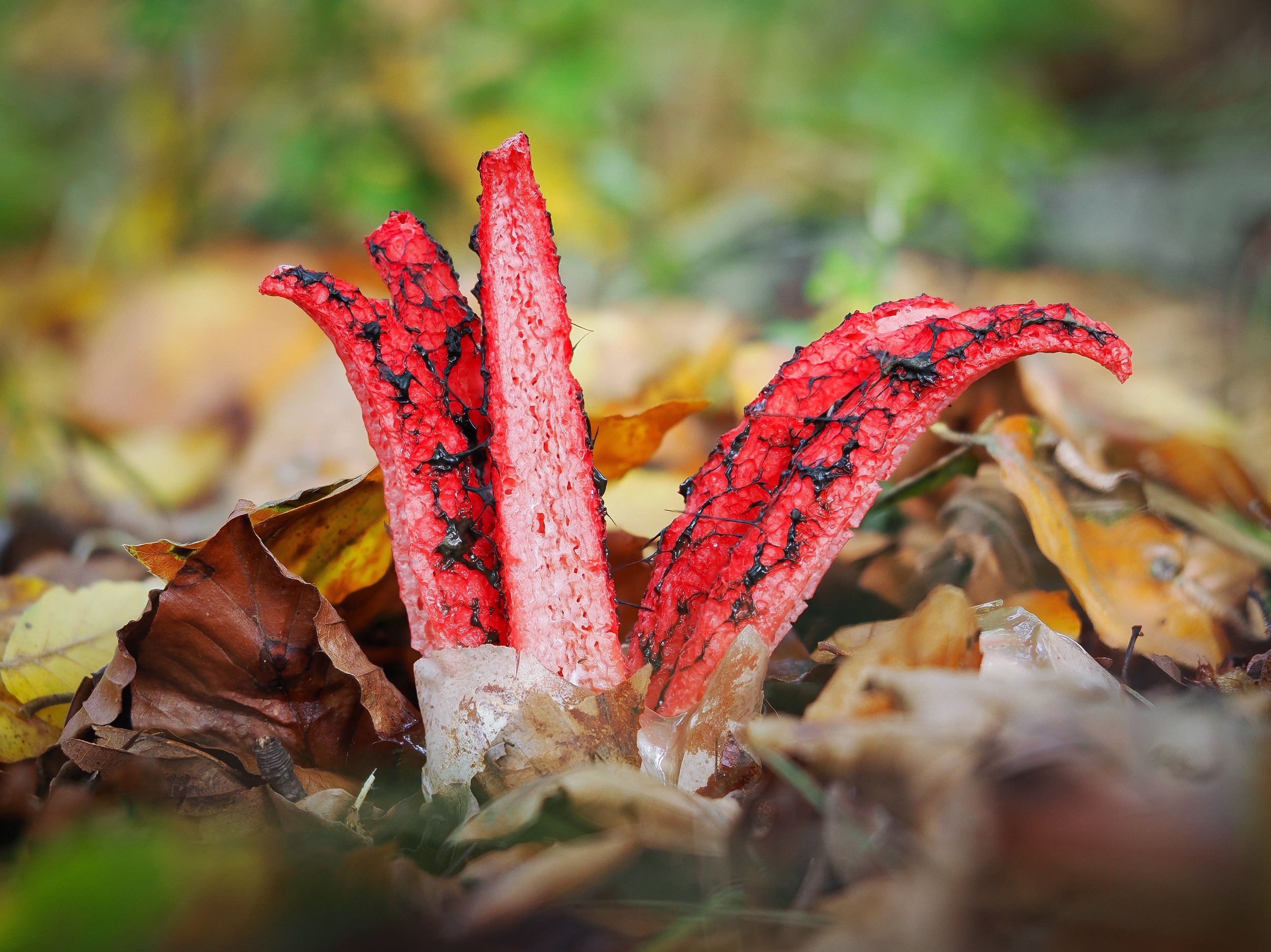 De inktviszwam is een bizarre verschijning met de officiële naam Clathrus archeri. Hij begint z’n leven als een soort slijmerig ei, verstopt tussen het gevallen blad. Maar zodra hij “uitkomt”, barst het ei open en vouwen zich een paar bloedrode tentakels naar buiten – vaak vier tot zes – met aan de binnenkant een zwart, stinkend goedje dat vliegen aantrekt. Alsof hij zelf ook niet helemaal blij is dat hij er is.