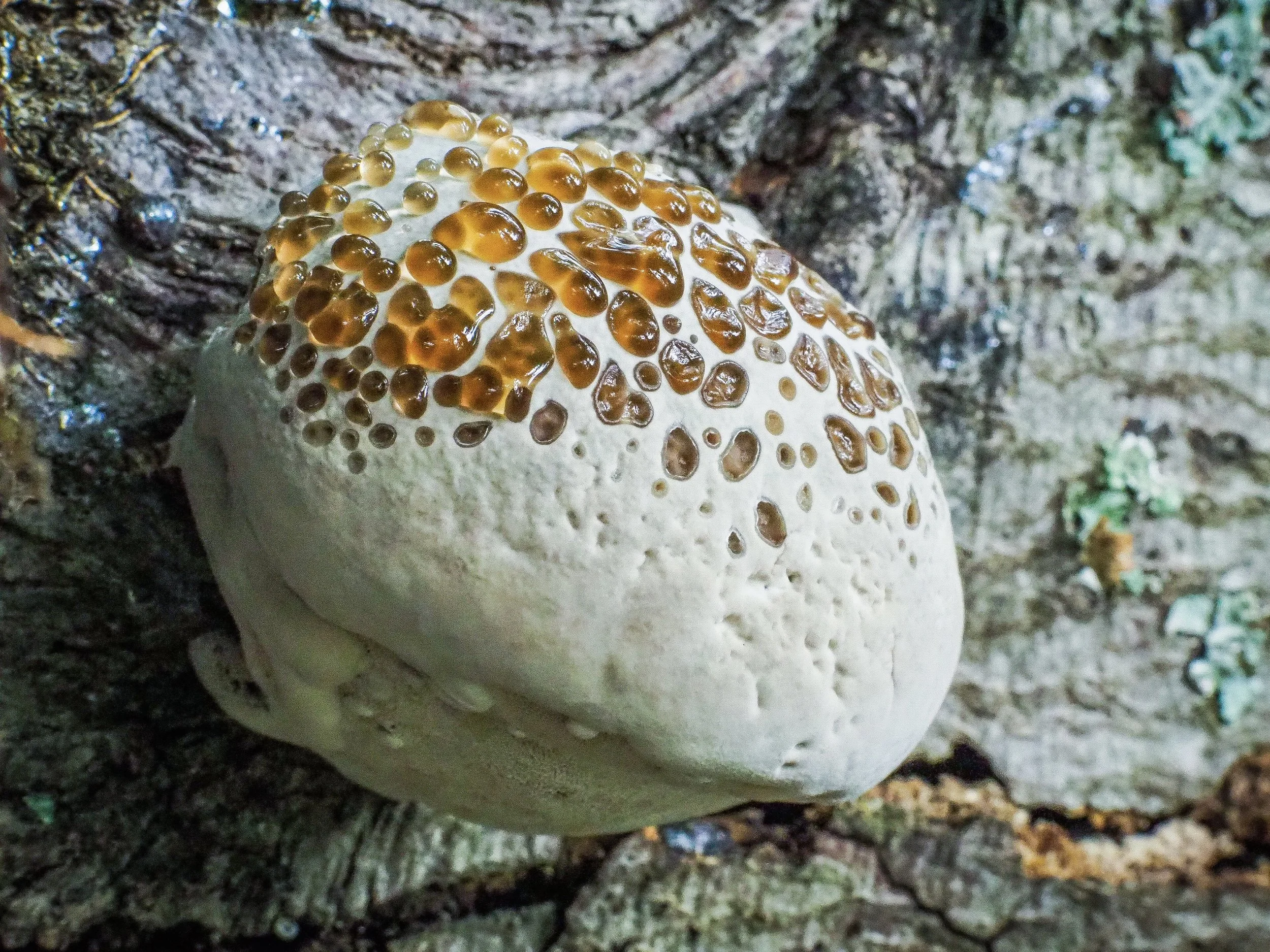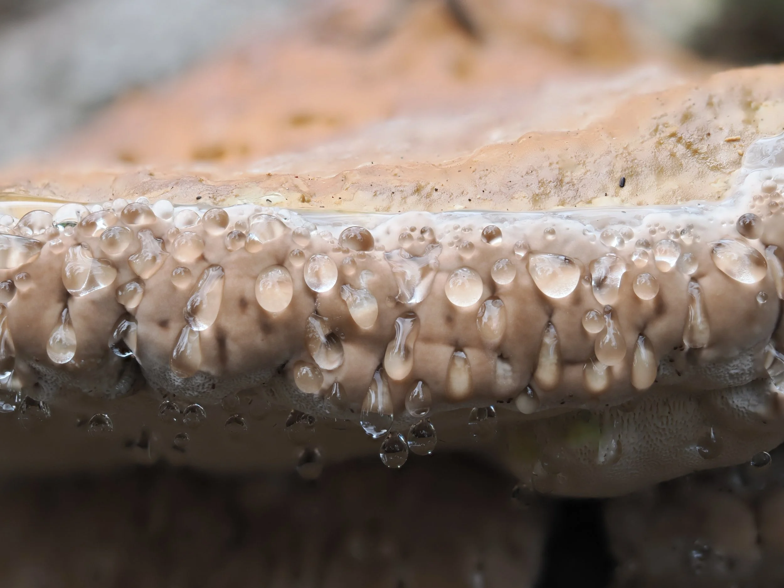 Fotograferen: absoluut. De druppeltjes geven een prachtig effect, vooral met tegenlicht. Aanraken kan ook geen kwaad, al kunnen de druppels bij sommige soorten iets zurig of plakkerig aanvoelen. Eten? Nope. De meeste houtzwammen zijn taai of oneetbaar.
